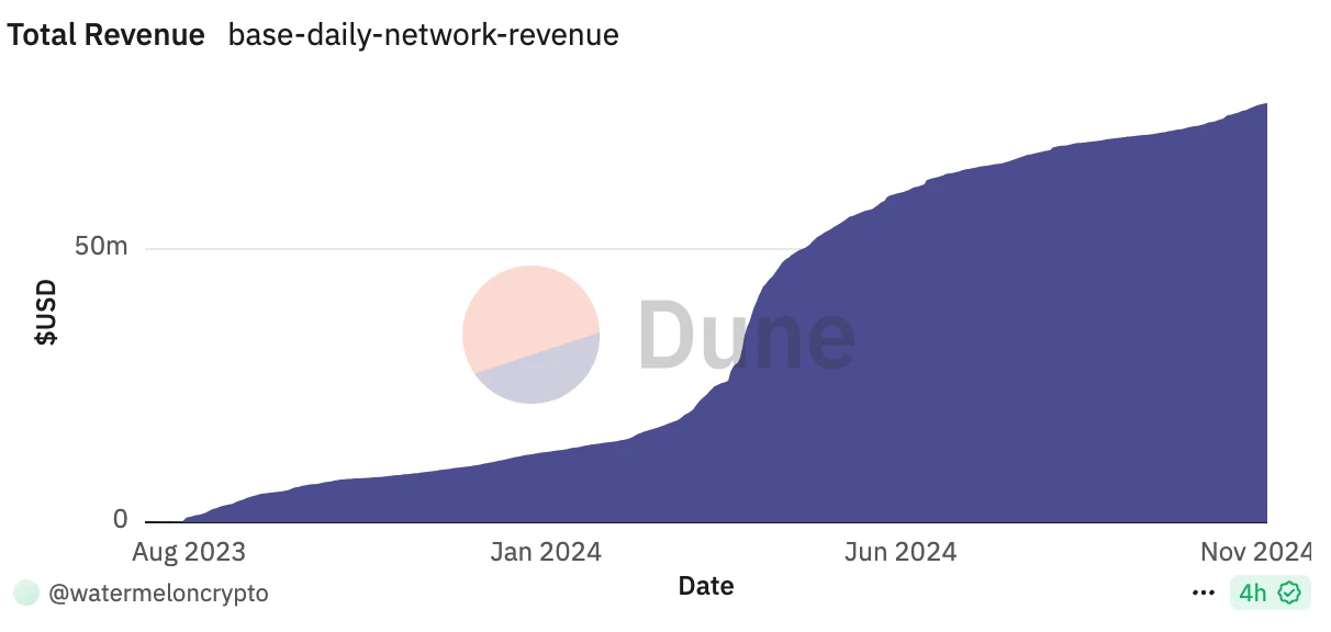 从 Base 链的收入图我们可以看出,Base 链在 2024 年 3 月份的总计收入是 1978 万美元,截止到现在的收入为 7655 万美元,从而我们可以计算出,Base 链上收入在 3-10 月中总计增幅达到了 287% ,月平均增幅达到了 41% ,可以看出随着链上用户和活动的增加,Base 的收入保持了相当高的增长幅度。