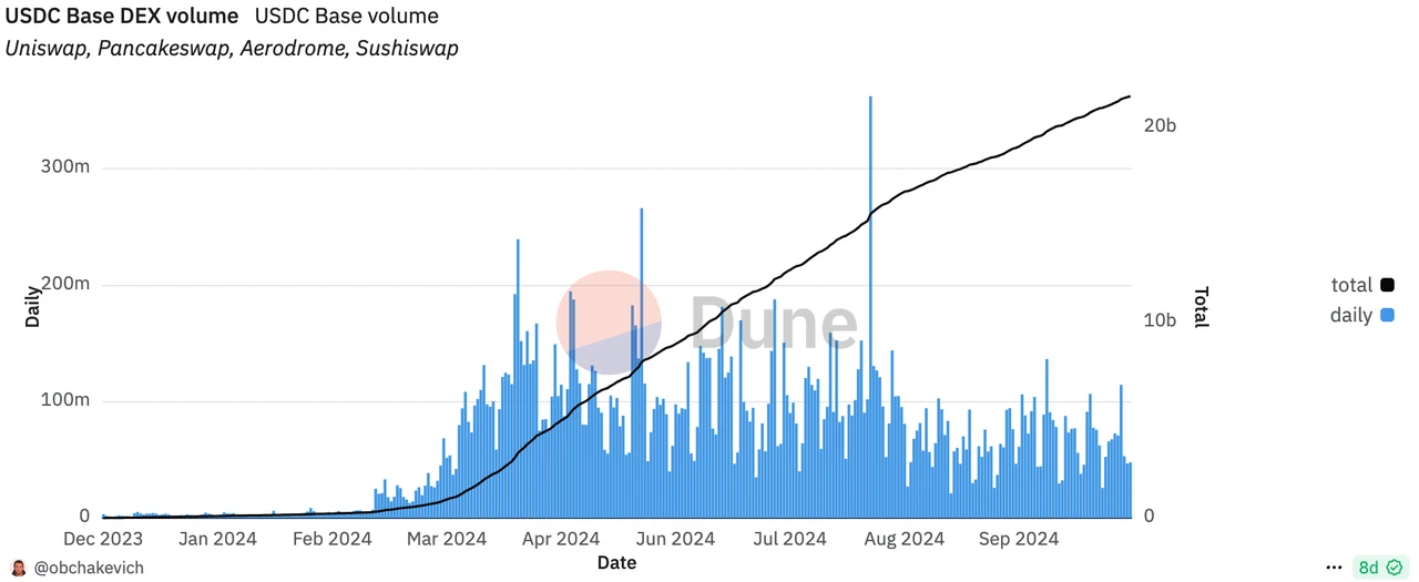 图-8 USDC 在 Base 链上 DEX 的交易金额(数据来源:https://dune.com/obchakevich/usdc-base)