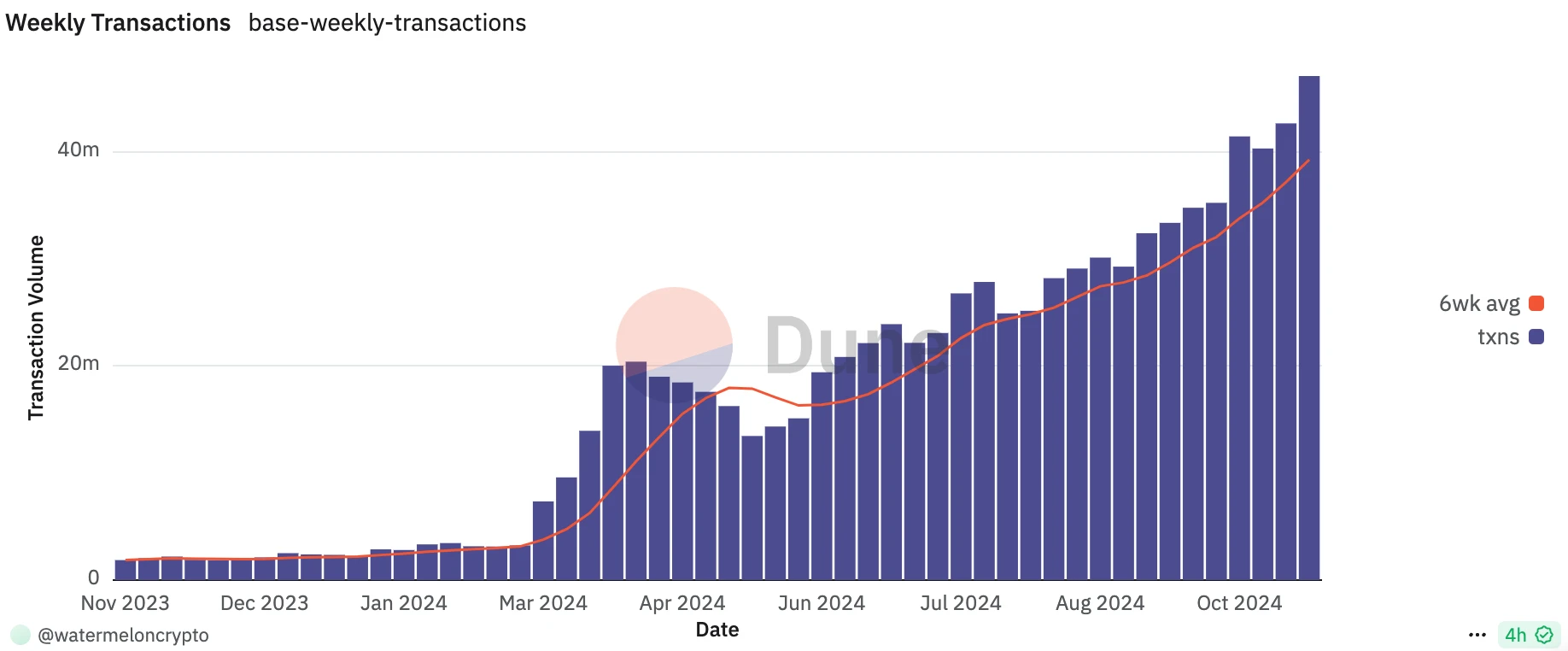 从 Base 链每周交易量的图表中我们可以看出,Base 链的每周交易量在 2024 年 5 月份的时候开始持续增长,其在 2024 年 5 月时周交易量为 1345 万,截止到现在的周交易量为 4706 万,我们可以计算出,Base 链上每周交易量在 5-10 月中总计增幅达到了 249% ,月平均增幅达到了 49% ,可以看出来 Base 链上的交易量一直保持快速且持续的增长。