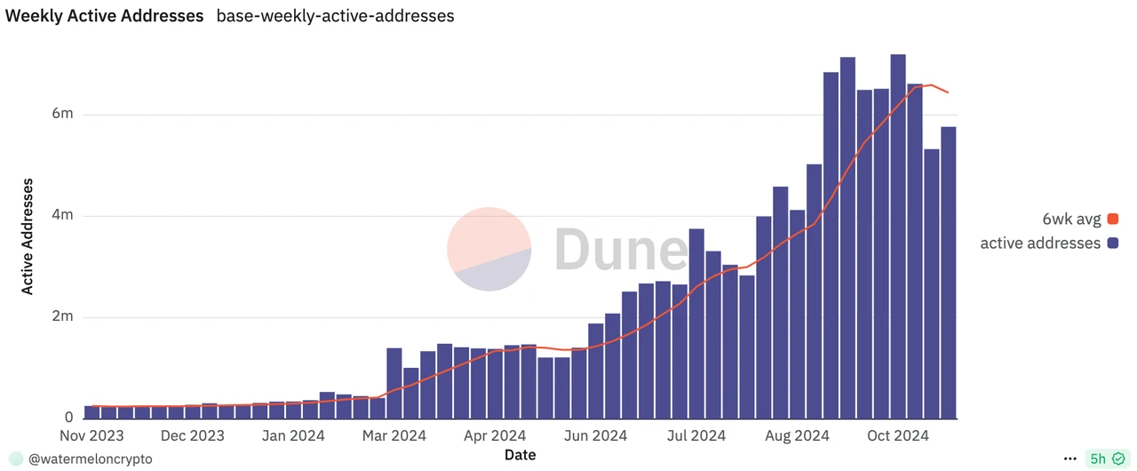 图-6 Base 链上周活跃地址(数据来源:https://dune.com/watermeloncrypto/base)