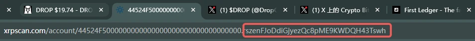 这里需要注意的是,XRP 生态中的代币地址基本都以重复的数字开头,最后小写打头的 r 字母开始才是代币的 CA;拿不准的玩家可以点击 Dex Screener 中的对应代币页面到 xrp 自己的浏览器 xrpscan,然后如下图所示的红框中复制出来即可找到 CA(对大小写敏感)。