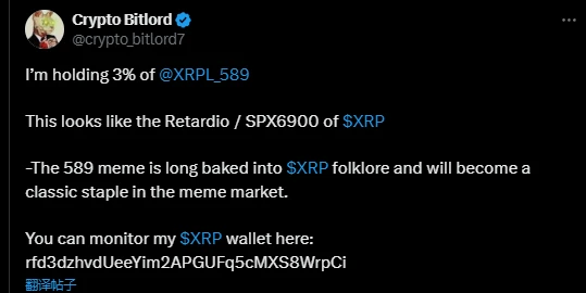 这个看起来和 985 反着的奇怪数字,实际上在指代希望 XRP 涨到 589 。