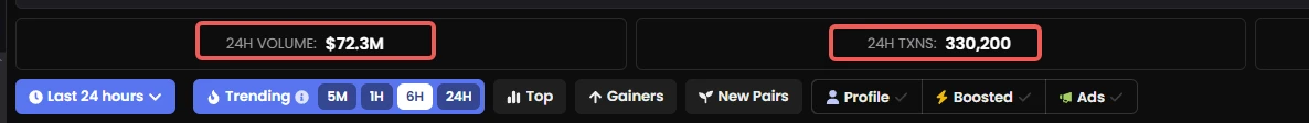 Dex Screener 数据显示,该生态内链上 24 小时交易量达到了 70 M 以上,交易笔数来到了 33 万笔,晃眼一看还以为是 Solana。