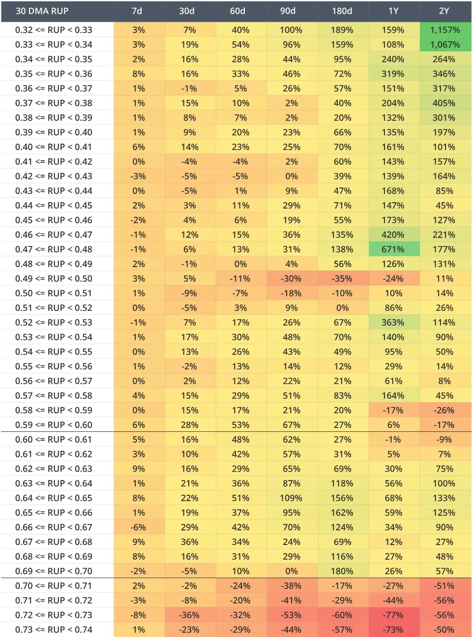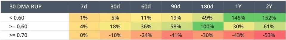 对过去两轮市场周期的分析表明, 30 DMA RUP 在 0.60 和 0.70 之间的水平通常能带来最高的短期至中期回报(7 天至 180 天)。这一区间通常反映牛市的中期阶段,此时市场乐观情绪正在上升,但尚未达到过度水平。相比之下,当 RUP 超过 0.70 时,各时间范围内的回报率始终呈现负相关,强化了其作为强力卖出信号的作用。
