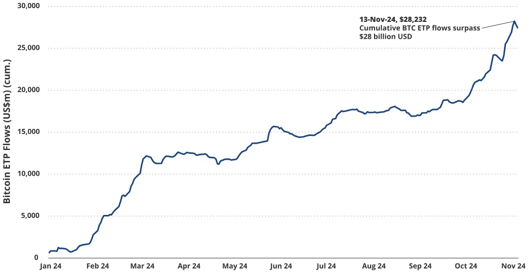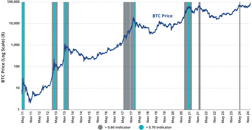 正如我们 9 月所预测,比特币(BTC)价格在大选后出现高波动性上涨行情。如今,比特币进入没有技术性价格阻力的未知领域,我们相信牛市的下一阶段才刚刚开始。这一模式类似于 2020 年大选后,比特币价格在年底前翻倍,并在 2021 年进一步上涨了约 137% 。随随着政府对比特币支持态度的重大转变,投资者的兴趣正在快速增加。近期,我们接到的投资咨询数量激增,许多投资者意识到自己在这一资产类别中的配置明显不足。尽管我们密切关注市场是否会出现过热迹象,但仍重申对本轮周期比特币价格目标 18 万美元 /BTC 的预测,因为跟踪的关键指标显示出持续的看涨信号。