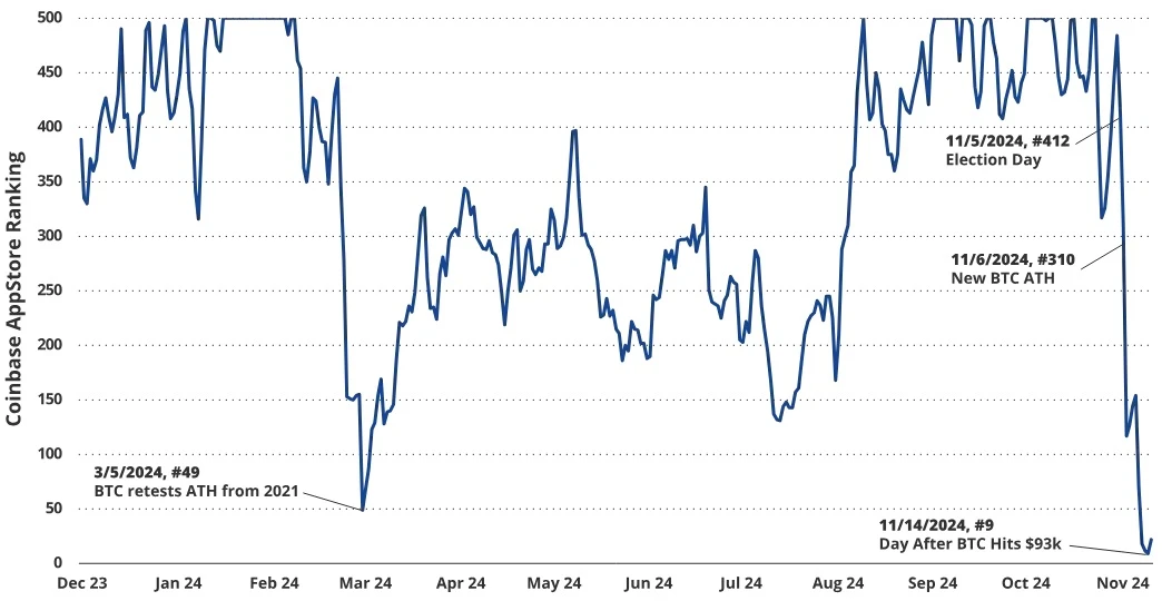 与 Google 对「加密货币」的搜索热度类似,Coinbase 在应用商店中的排名也是衡量散户投资兴趣的重要指标。今年 3 月 5 日,在比特币价格于 9 天内飙升约 34% ,并重新测试 2021 年的历史高点约 69, 000 美元后,Coinbase 重新进入了应用商店排名前 50 名。尽管比特币在同月后期达到约 74, 000 美元的新高,但随着价格波动性下降至夏季低迷期,并且公众注意力转向总统选举,散户兴趣有所减弱。然而,比特币在选举之夜的突破再次点燃了散户的兴趣,Coinbase 的应用商店排名从 11 月 5 日的第 412 名跃升至 11 月 14 日的第 9 名。参与度的激增推动价格的进一步上涨,同时创下了比特币 ETF 流入量的新纪录。