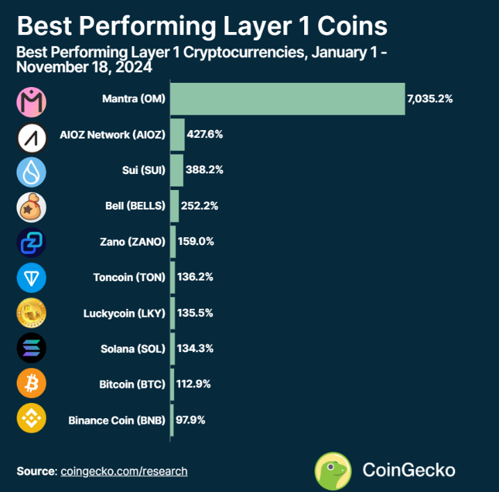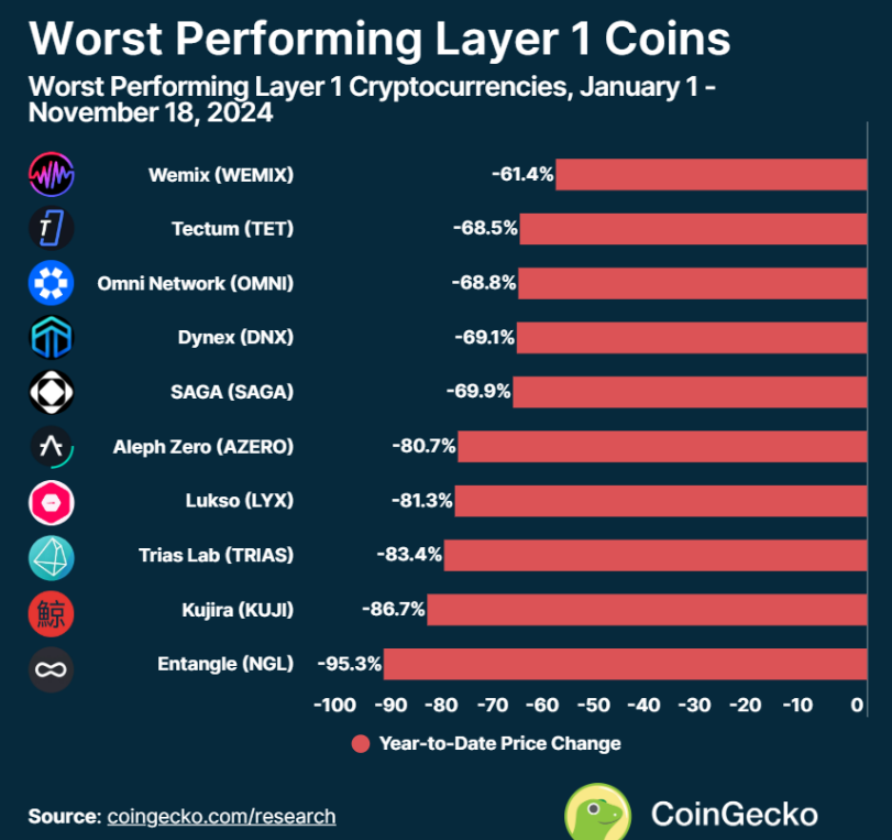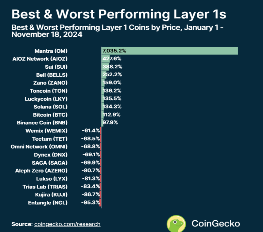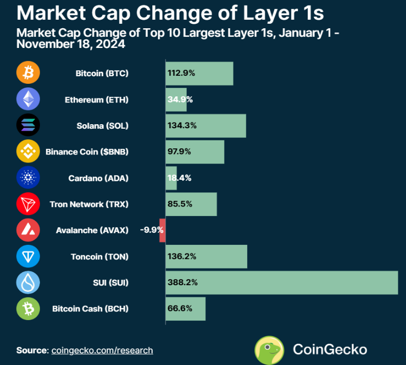 注:本研究分析了 CoinGecko 中 Layer 1 类别下按市值排序的前100种加密货币的价格收益情况。数据统计的 YTD 涨幅覆盖从2024年1月1日到11月18日的表现。这些数据反映了市场的一个截面,反映了各个币种在更广泛市场环境中的表现差异。