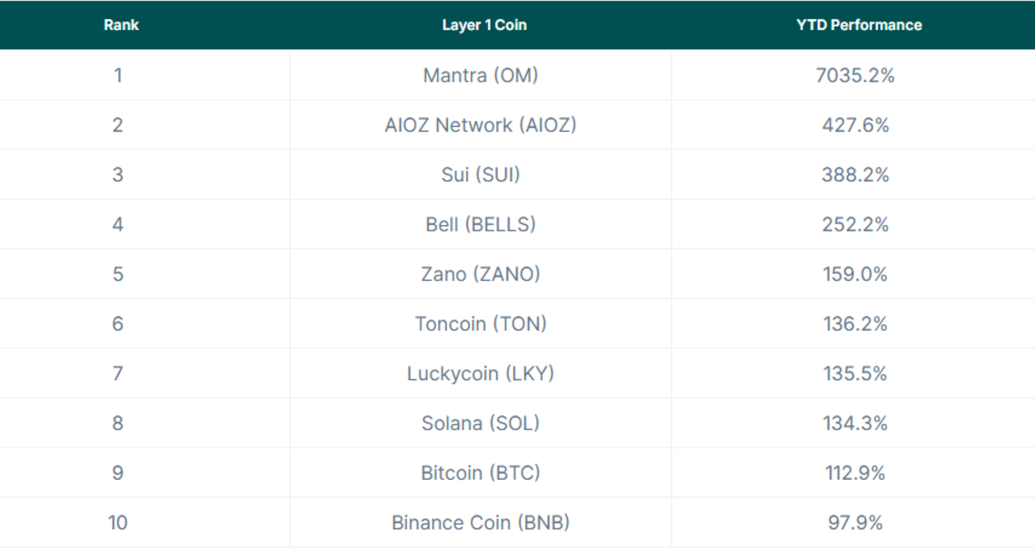 AIOZ Network (AIOZ)是另一位表现突出的选手,今年至今(YTD)增长了427.6%。该平台的去中心化内容分发网络在持续的生态系统优化推动下,得到了越来越多的采用。排在前三的还有Sui (SUI),YTD增长了388.2%,受益于其生态系统内的快速发展,包括利用其高扩展性和开发者友好特性的创新dApp推出。