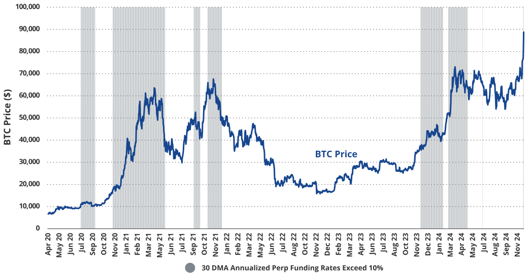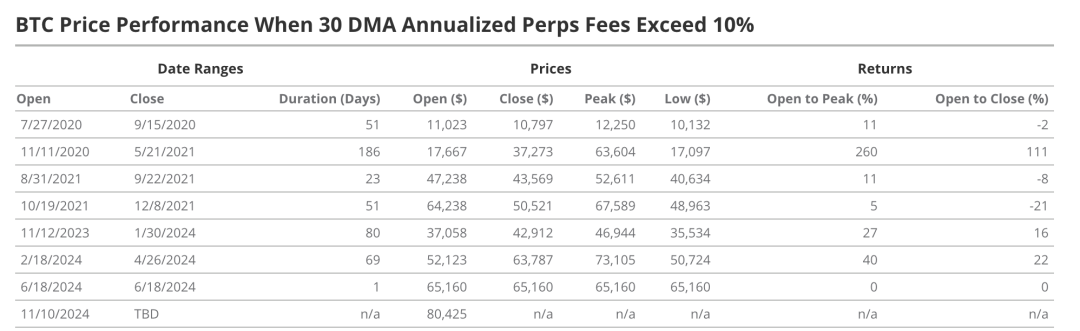 比特币价格通常在 30 日移动平均资金费率(30 DMA Perp Funding Rates)超过 10% 并持续 1 至 3 个月时表现出过热迹象。