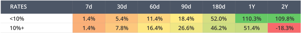 然而,资料显示,在更长时间范围记忆体在著表现不佳的模式。平均而言,在资金费率超过 10% 的日子购𧹒的比特币,从 180 天𫔭始表现落后于市场,且在 1 年和 2 年的时间范围内这一趋势愈加显著。由于市场周期通常持续约 4 年,此模式显示持续高资金费率往往与周期顶部相关,并可能成为市场过热的早期讯号,显示其更容易受到长期下跌的风险。