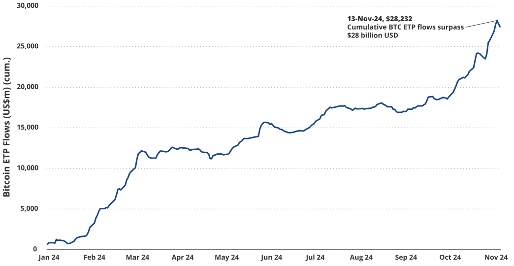 然而,选举之夜比特币价格的飙升发生在亚洲交易时段,很可能是由于大量美国投资者围绕选举进行交易。这一特殊事件使得难以将此类价格波动完全归因于区域动态。与历史行为一致,美国和欧洲交易时段的交易者继续增持比特币,维持了 10 月观察到的价格表现趋势。