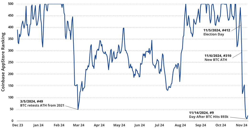 与 Google 对「加密货币」的搜寻热度类似,Coinbase 在应用程式商店的排名也是衡量散户投资兴趣的重要指标。今年 3 月 5 日,在比特币价格于 9 天内飙升约 34%,并重新测试 2021 年的历史高点约 69,000 美元后,Coinbase 重新进入了应用商店排名前 50 名。侭管比特币在同月后期达到约 74,000 美元的新高,但随著价格波动性下降至夏季低迷期,并且公眾注意力转向总统选举,散户兴趣有所减弱。然而,比特币在选举之夜的突破再次点燃了散户的兴趣,Coinbase 的应用商店排名从 11 月 5 日的第 412 名跃升至 11 月 14 日的第 9 名。参与度的激增推动价格的进一步上涨,同时创下了比特币 ETF 流入的新纪录。