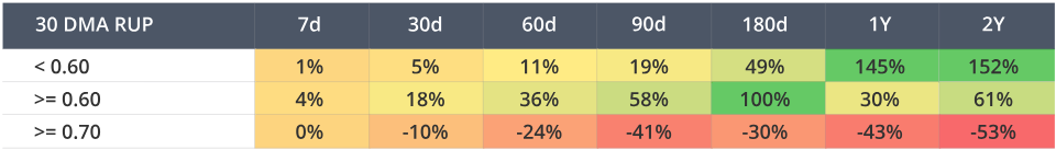 对过去两轮市场周期的分析表明,30 DMA RUP 在 0.60 和 0.70 之间的水平通常能带来最高的短期至中期回报(7 天至 180 天)。这一区间通常反应多头市场的中期阶段,此时市场乐观情绪正在上升,但尚未达到过度水平。相较之下,当 RUP 超过 0.70 时,各时间范围内的报酬率始终呈现负相关,强化了其作为强力卖出讯号的作用。