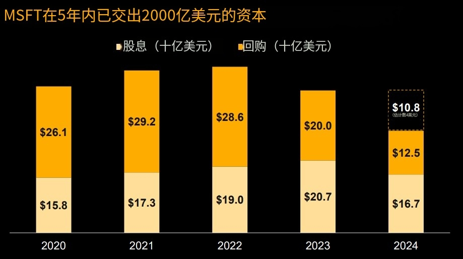 而微软在 5 年内已回购 2000 亿美元的资本。