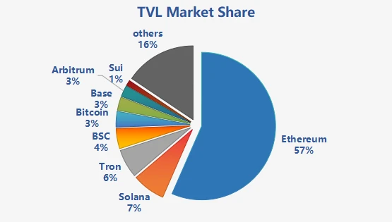 按公链进行划分,TVL 最高的三条公链中,分别是 Ethereum 链占比 57% ;Solana 链占比 7% ;Tron 链占比 6% 。