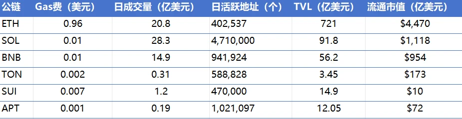 主要从日交易量、日活跃地址、交易费用和总锁仓量(TVL),分析目前主要公链 ETH、SOL、BNB、TON、SUI 以及 APT 的相关数据。