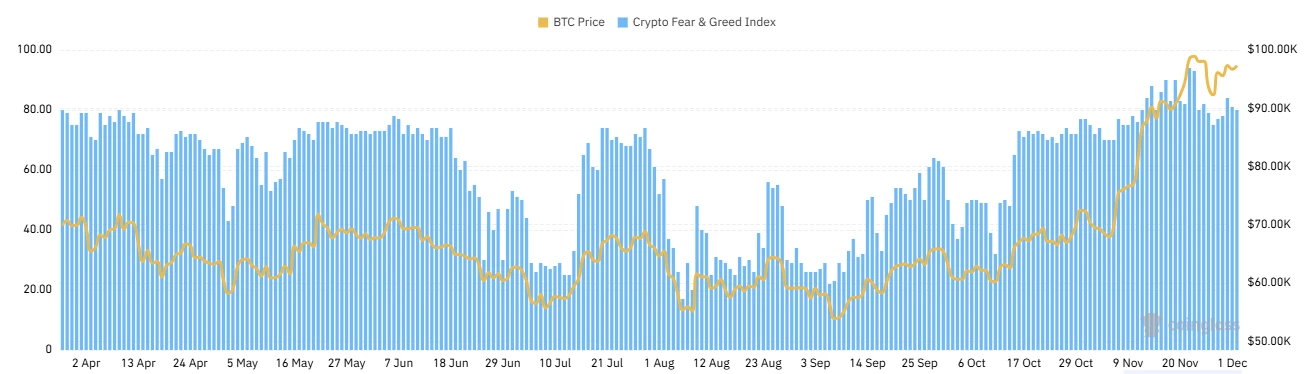 加密货币恐慌指数为 80 ,显示为贪婪。