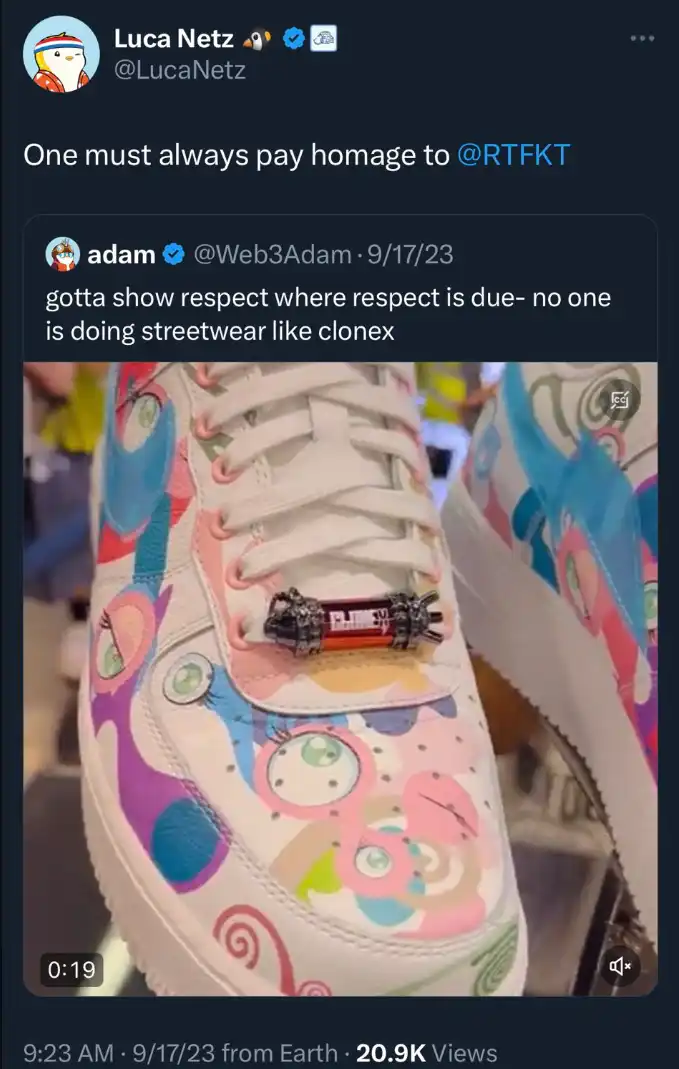 Luca 在去年的 9 月 17 日发布向 RTFKT 致敬的推文
