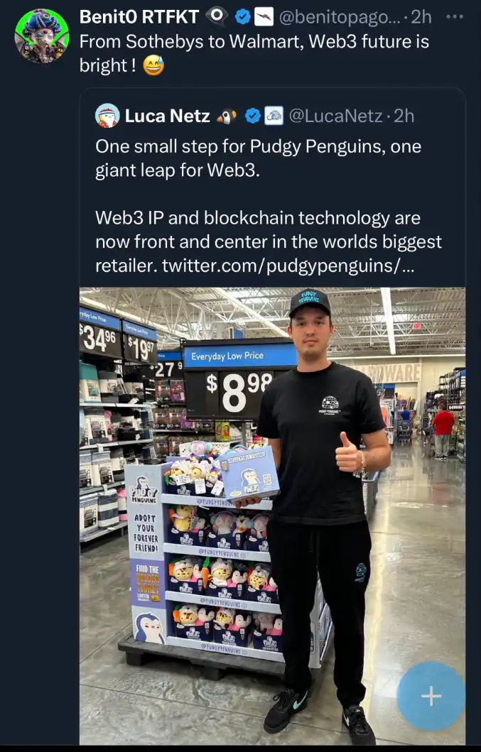 而在 10 天之后,@benitopagotto 对 Pudgy Penguins 的玩具进入沃尔玛一事进行了嘲讽,「从苏富比拍卖行到沃尔玛,Web3 的前途真是一片光明啊!」