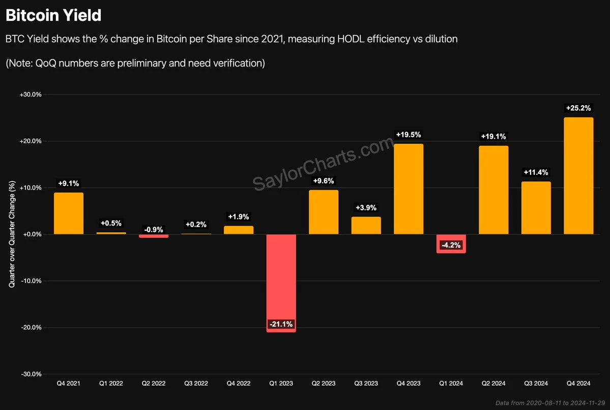 公司 KPI 核心:每股含币量 Bitcoin per share(财报里叫 BTC Yield)