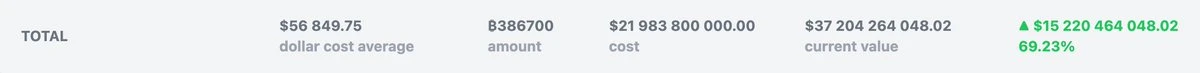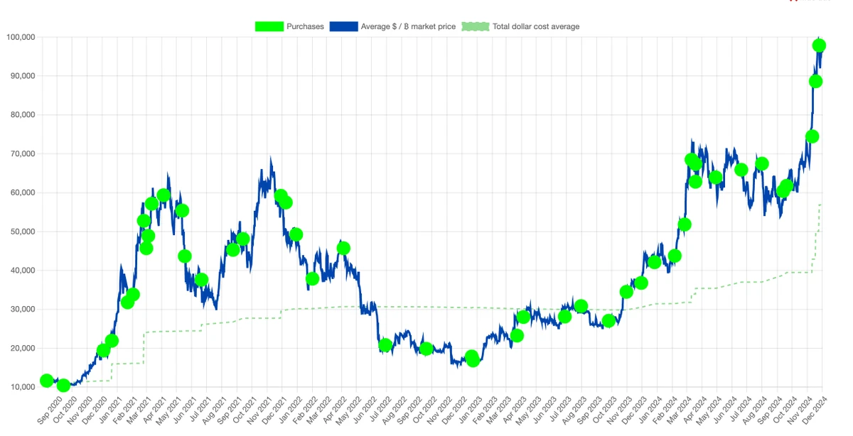 利用内部现金应计、股权和债务以约 220 亿美元的价格收购了 386700 枚比特币(成本约 56849 USD),目前以 95000 USD 的 BTC 价格计算,价值约 360 亿美元左右