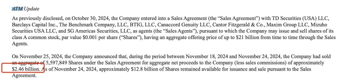 MSTR 的 ATM 市场价卖股: MSTR 于 2024 年 10 月 30 号一次性增发价值 210 亿的股票,这里大家注意,他是一次性增发大量股票,然后可以在未来三年内盘中交易的时候,随时卖出股票,且在卖出股票前不需要公告(所谓的 At the market "ATM)