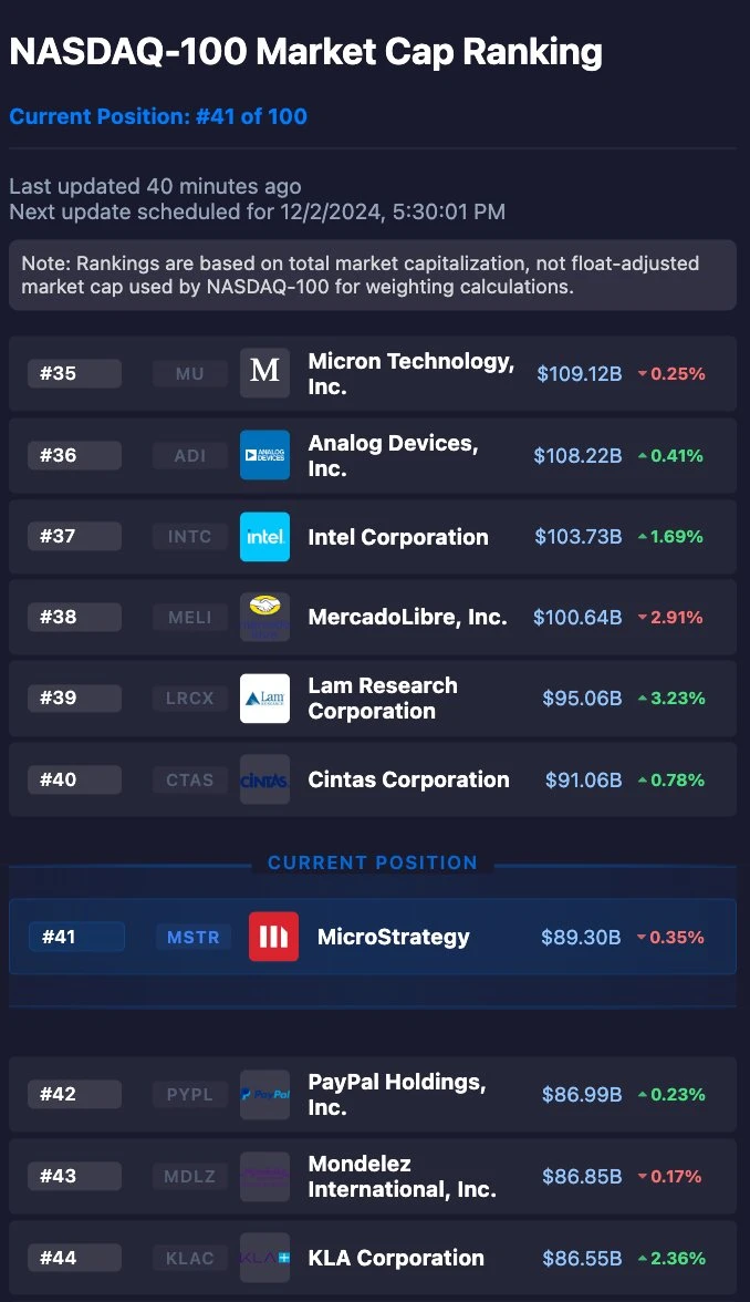 纳指每年年底会进行成分股调整,MSTR 目前已经符合所有要求