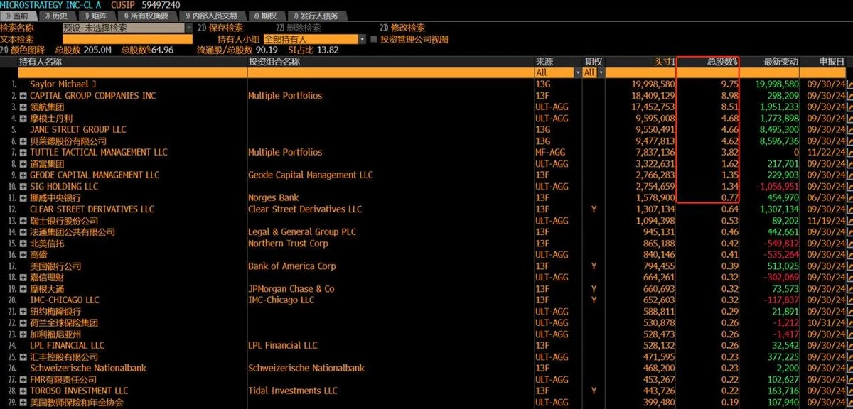 公司股东结构: 根据 2024 Q3末披露数据,老板 Saylor 为第一大股东,持股 9.75% ;其他前十大股东基本为各家资管公司的客户或者资管自营的钱持有(但要注意,对于普通 A 股来说,Saylor 的持股为 B 股,B 股每股有 A 股十倍的投票权,所以 该公司目前 Saylor 还是说了算)