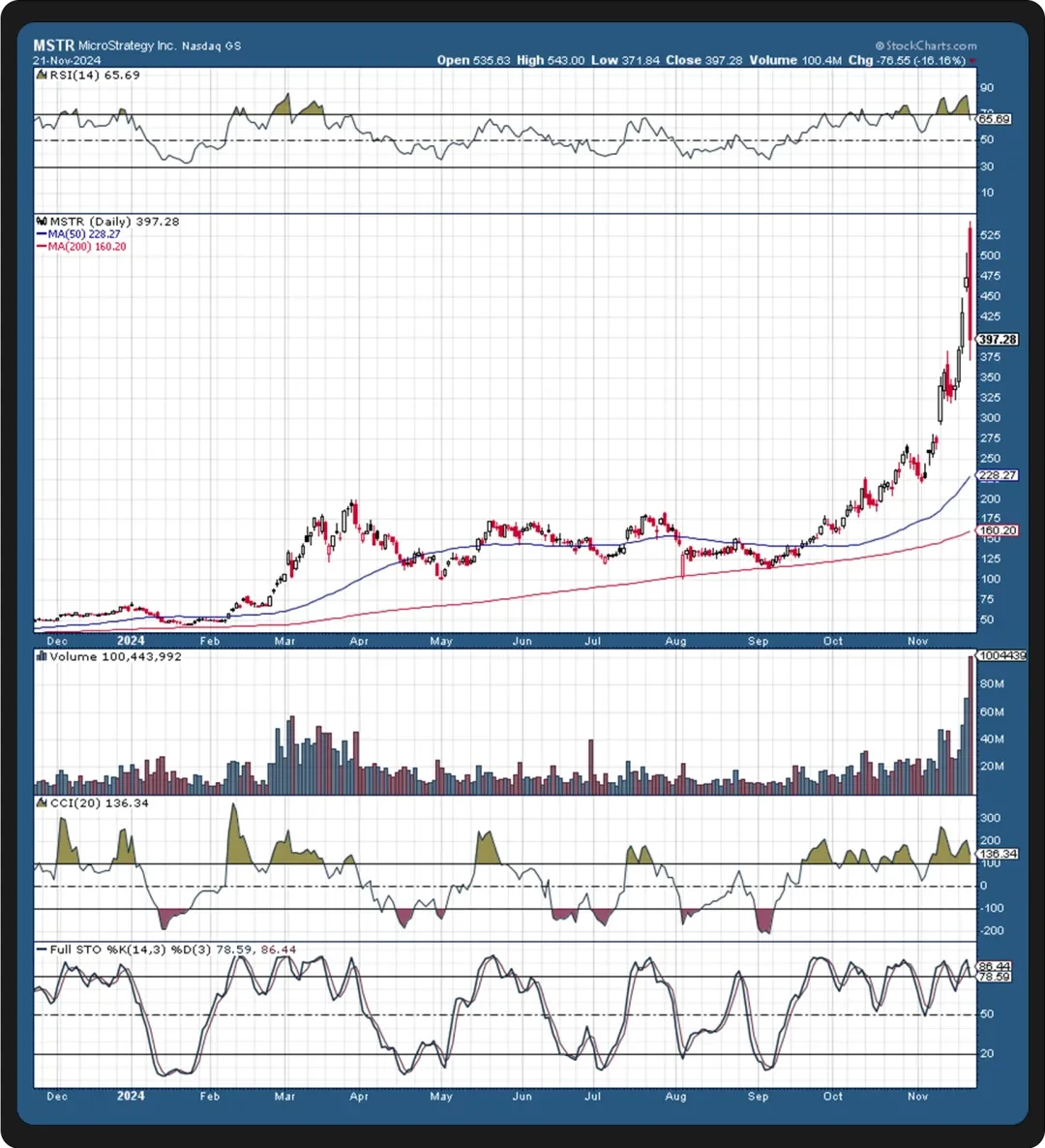 因此,加密货币当之无愧代替 AI 成为 11 月的股市新宠,人们也自然而然地在二级美股市场寻找着有关加密货币的机会。而整个 11 月的比特币狂欢中,横空出世的最大赢家是微策略(MSTR)——微策略 11 月的股价最高涨幅超过 140% 。