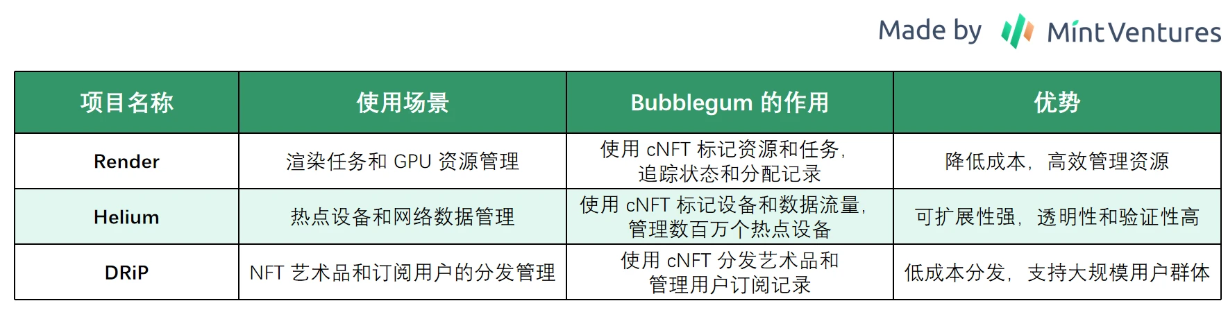 Bubblegum 是 Metaplex 用于创建和管理压缩 NFT(cNFT)的程序。通过压缩技术,创作者能够以极低的成本铸造大量 NFT, 1 亿个 NFT 的铸造成本仅需 500 SOL(相比传统铸造方式实现了超过 99% 的成本降低),提供了前所未有的扩展性和灵活性,也正是由于 Bubblegum 技术的推出,大规模低成本的 NFT 铸造成为可能,Render、Helium 在内的 DePIN 项目才开始迁移到 Solana,也催生了 DRiP 这样创新的 NFT 平台,以下表格是这三个代表对 Bubblegum 的应用实例列举。