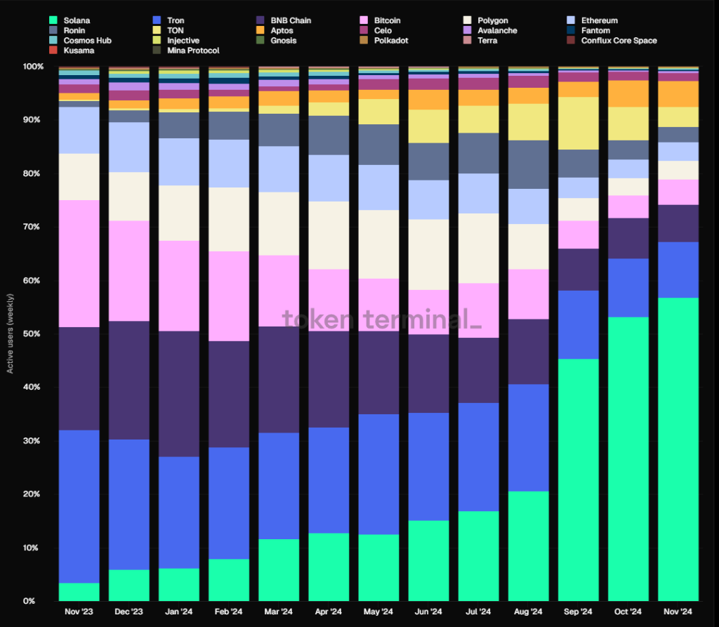 L1 月度活跃地址数市场份额占比,数据来源:tokenterminal