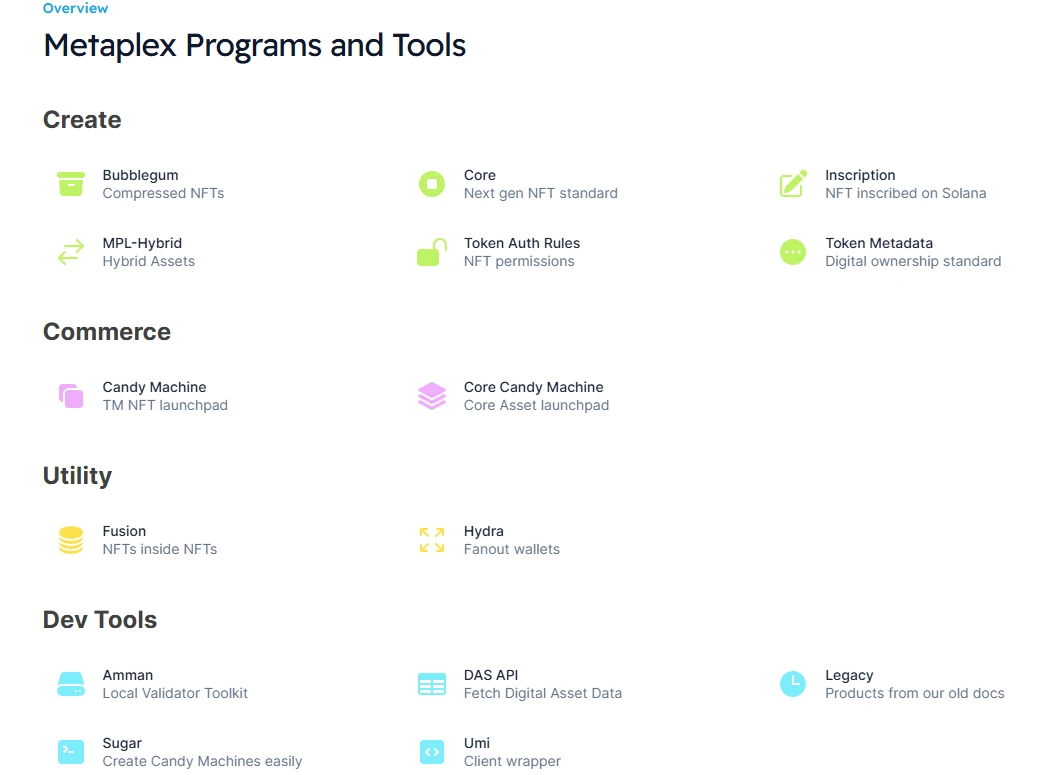 Metaplex 作为一个资产发行、管理和标准系统,其服务的资产对象既有 NFT,也有同质化代币,以下罗列的产品构成了一个服务于 Solana 生态资产的综合矩阵。