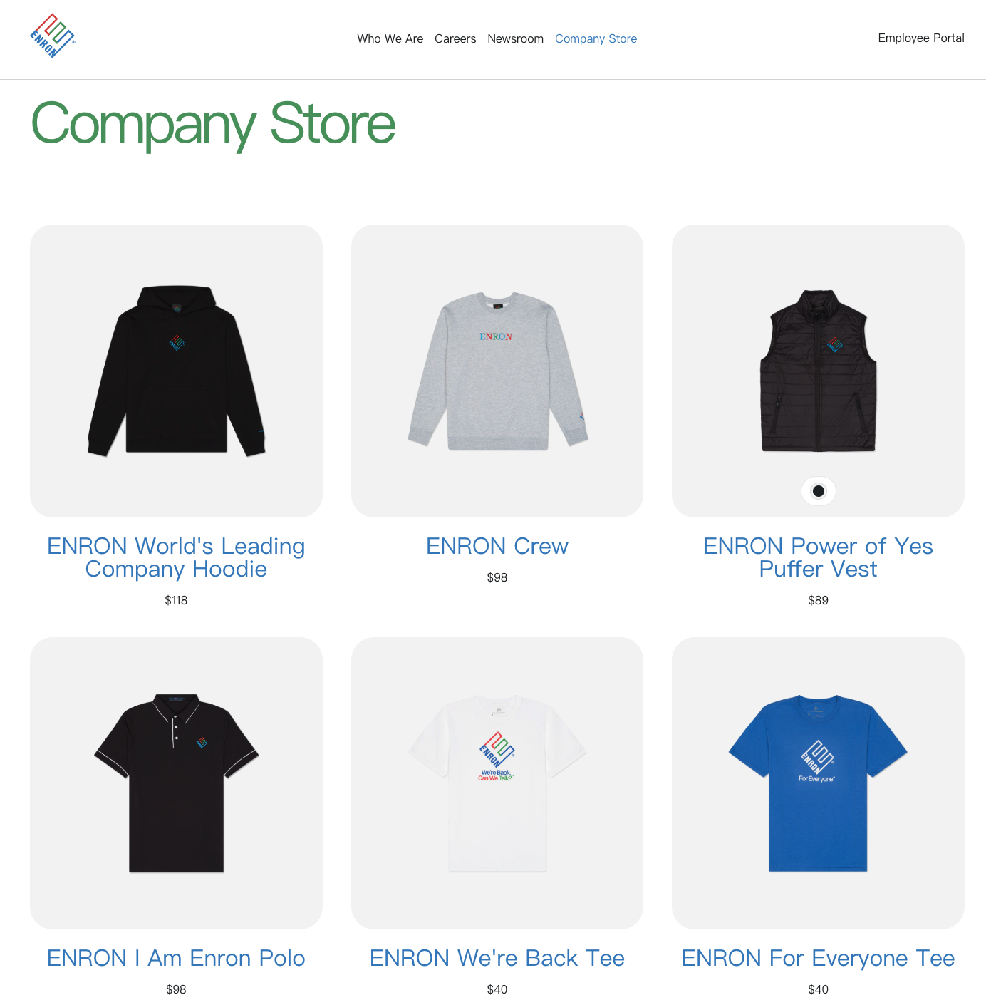 同时,您可以点击进入该网站的「公司商店」页面,流览一系列安隆品牌连帽衫(税前和运费前 118 美元)、羽绒背心(89 美元)、T 恤(40 美元)、棒球帽(40 美元)、无簷小便帽(30 美元)和印有「你有很大的能量」口号的水瓶等商品。