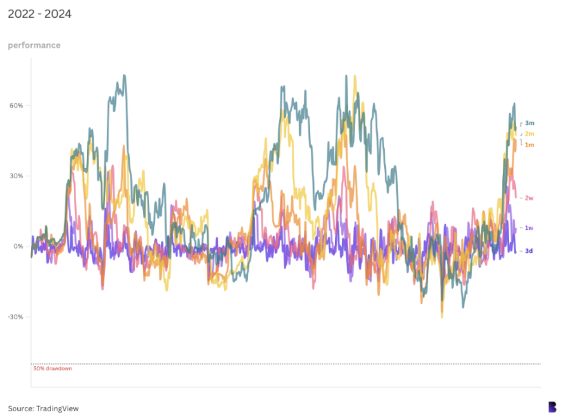 比特币在几乎所有时间跨度内都下跌了 50% 或更多,唯独三个月的时间跨度略低于 50%,为 47%。