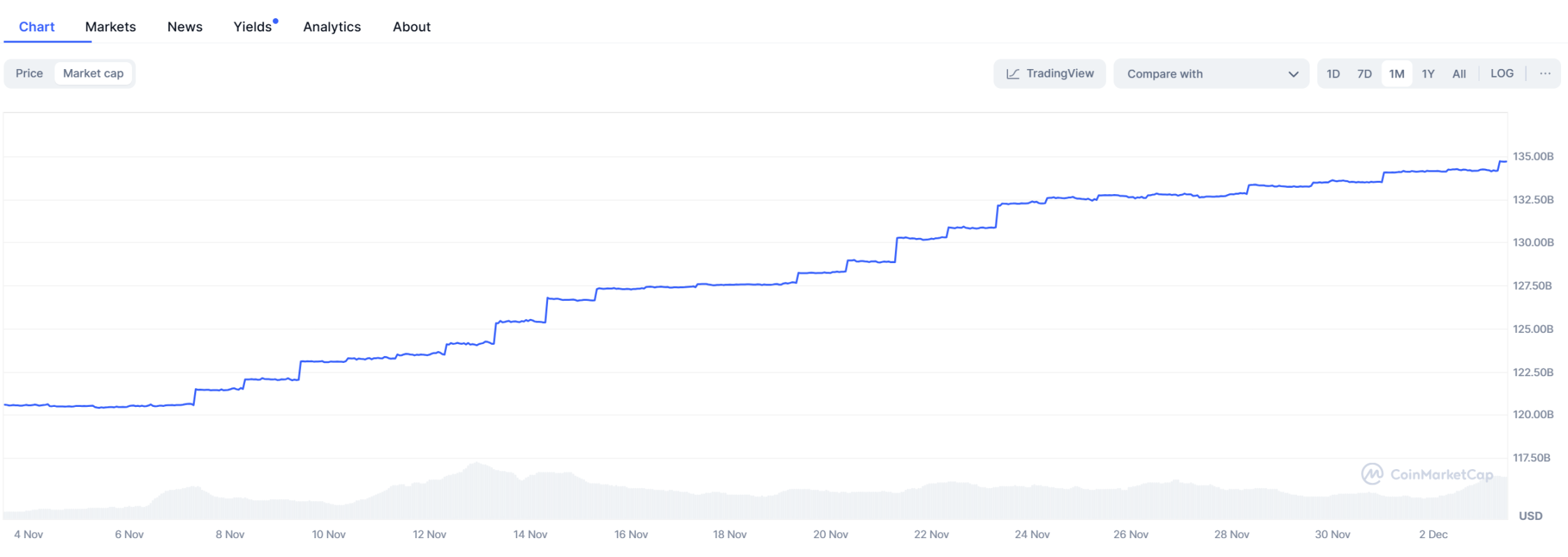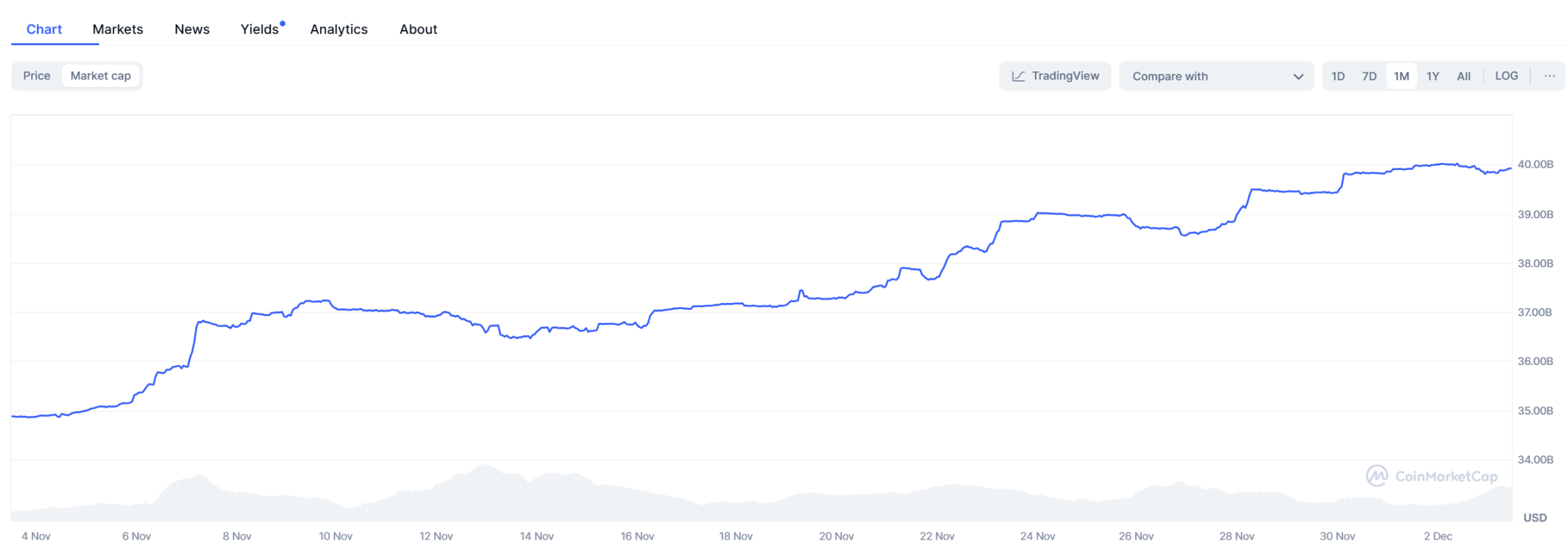USDC 市值也从本月初的 150 亿美元,升至 400 亿美元附近。