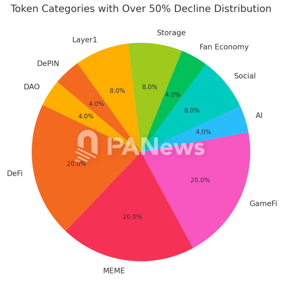 在这 25 个回拨最大的代币的占比来看,MEME 币、DeFi 和游戏相关的代币占比最高,均占到 20%。