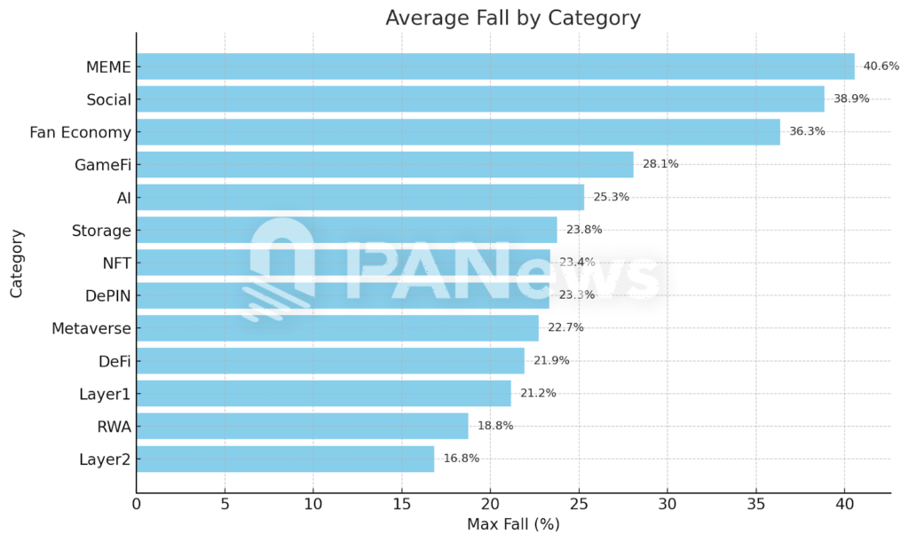MEME 币的市场热度自然不用多做介绍,今年在主流山寨币多数时间沉寂的时间裡,MEME 一直是和比特币比翼齐飞的赛道。不过,MEME 板块的整体在高点后回拨的幅度是最大的,均值达到了 40% 以上。这也再一次提醒人们冲狗的同时还要多关注波动。