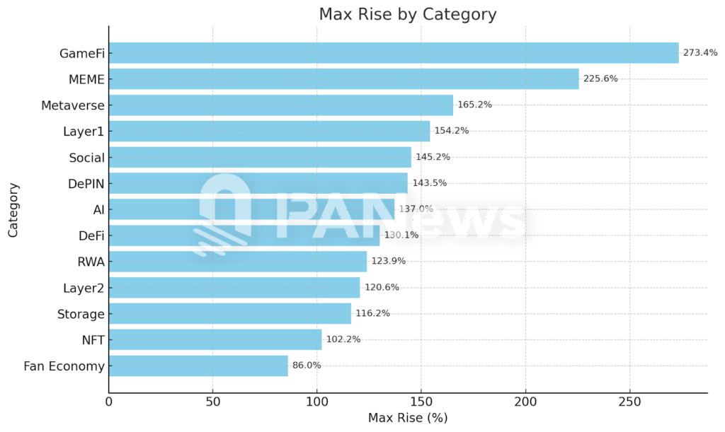 哪些板块才是目前市场上最热门的赛道?从彙总的结果来看,游戏概念相关的代币平均最大涨幅达到了 273.4%,成为当下最热门的山寨赛道。其次是 MEME 币,平均最大涨幅为 225%,元宇宙、Layer1、社交等板块紧随其后。而涨幅最小的是粉丝经济板块(以各个足球队或俱乐部为题材的代币)仅为 85%。