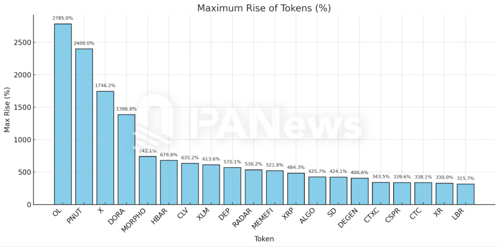 最后,来关注一下整体市场的回拨力度。整体市场虽然向好,但往往也意味著波动更大。PANews 统计了这些代币在达到高点之后的回拨幅度。从总体资料来看,有 25 个专案在达到高点后都出现了了 50% 以上的回拨幅度。其中回拨最大的几个代币为:DORA(92%)、MORPHO(88%)、MEMEFI(83%)、RADAR(78%)、DEP(77%)。