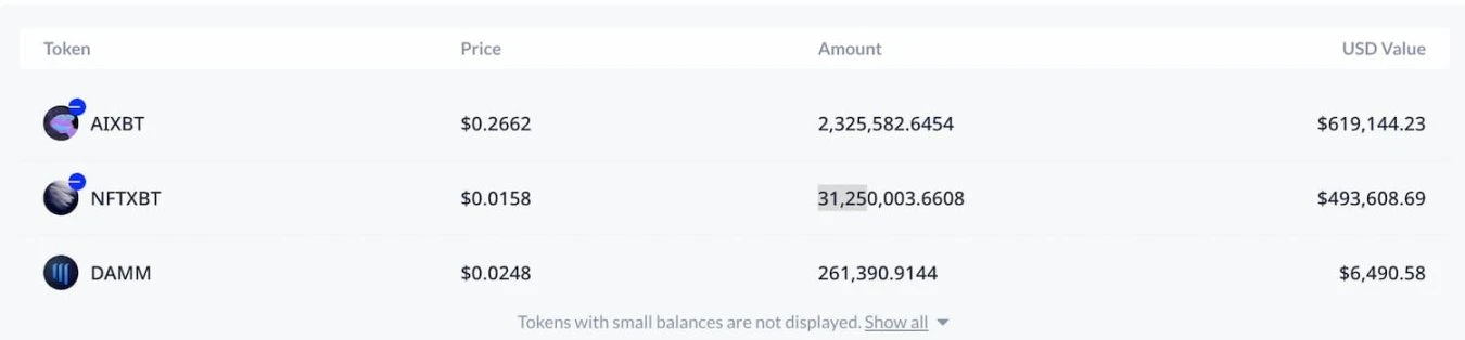笔者发现,Wintermute 近期在关注一些新的 AI 代理,比如 aixbt、nftxbt、Empyreal 和 Holoworld。当然,就其持仓价值而言,持仓最多的 AI 代理代币仍为 GOAT(做市目的),仅次于 MOODENG,持有价值达 3000 万美元。