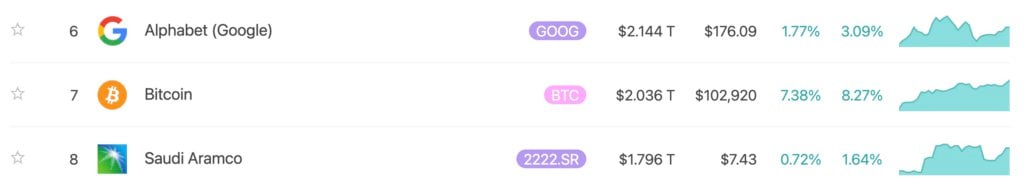BTC 市值超越沙乌地阿拉伯国家石油,位列全球第 7 大资产