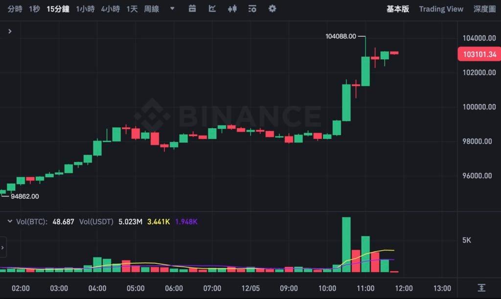 比 特币在今日约 10:30 左右正式突破 10 万美元大关并持续写下历史新纪录,币安现货市场上目前最高一度来到 104,088 美元。截稿前报 103,101 美元,持续的在高点震盪。 当前市场变动激烈,请投资人注意风险。