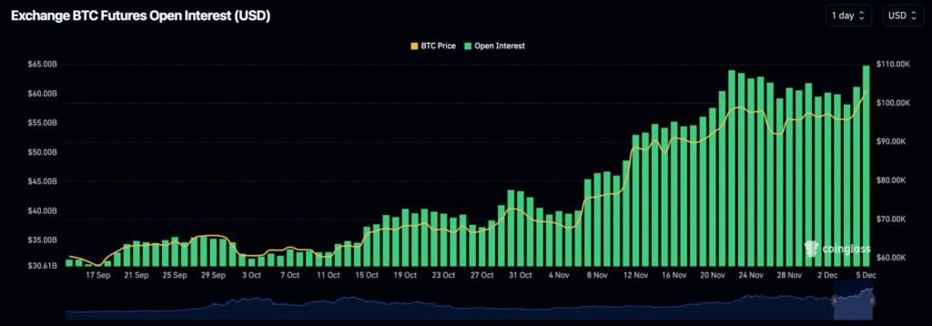 根据 Coinglass 数据 显示 ,全网比特币期货合约未平仓部位为 42.4 万枚 BTC(约 674 亿美元)再度创下历史新高,请投资者小心可能持续放大的波动。