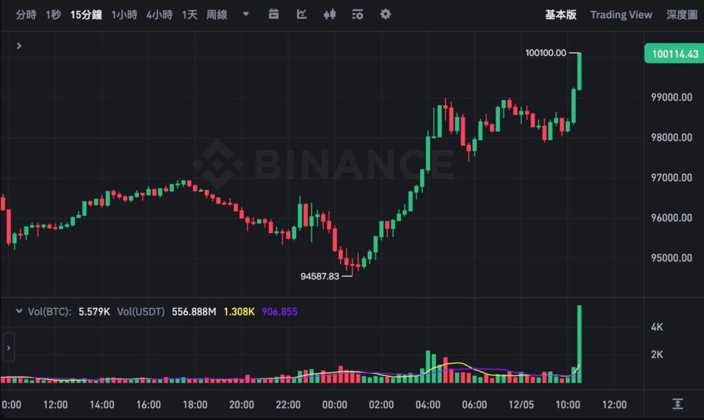 动 区快讯,BTC 在今日 10:30 正式突破 10 万美元大关!币安市场上最高来到 100,100 美元,当前市场变动激烈,请投资人注意风险。
