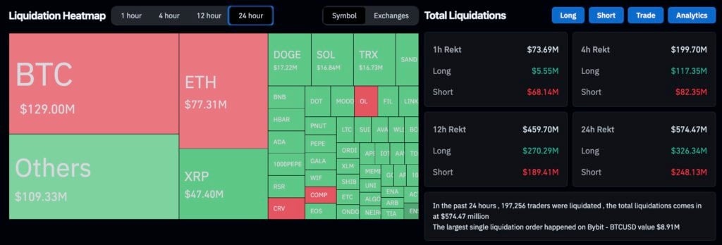 比特币剧烈波动的行情中,据 Coinglass 数据 显示,过去 24 小时,加密货币全网爆仓金额超过 5.7 亿美元,有近 20 万人遭清算。