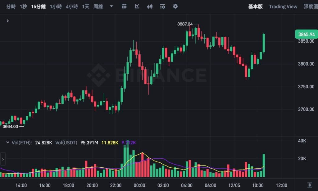以太坊部分则突破 3,850 美元,目前没有突破昨晚的前高,后市有待观察。