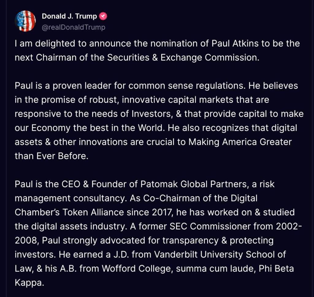 而在今日午夜,川普正式在 Truth Social 上发表 声明 ,提名对加密货币抱持友善立场的前 SEC 委员 Paul Atkins 来接替现任 SEC 主席Gary Gensler。