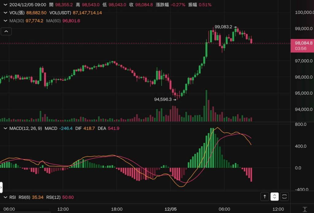 或许是受新任 SEC 主席对加密货币抱持友善立场激励,比特币稍早最低跌至 94,596 美元后就𫔭啟强力回弹,今晨七点左右再度冲破 9.9 万美元,截稿前略有回调,于 9.8 万美元震盪。