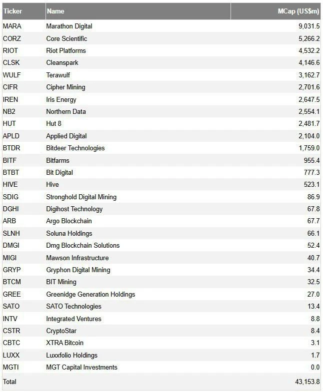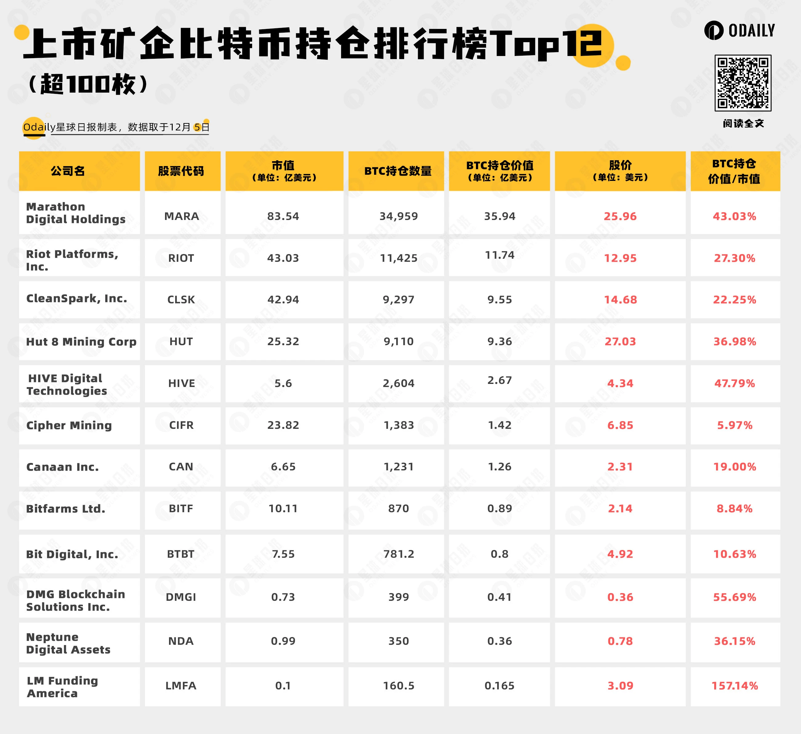 老牌矿企断档式领先:MARA、 RIOT、 CLSK、 HUT 持仓量均超 9000 枚 BTC