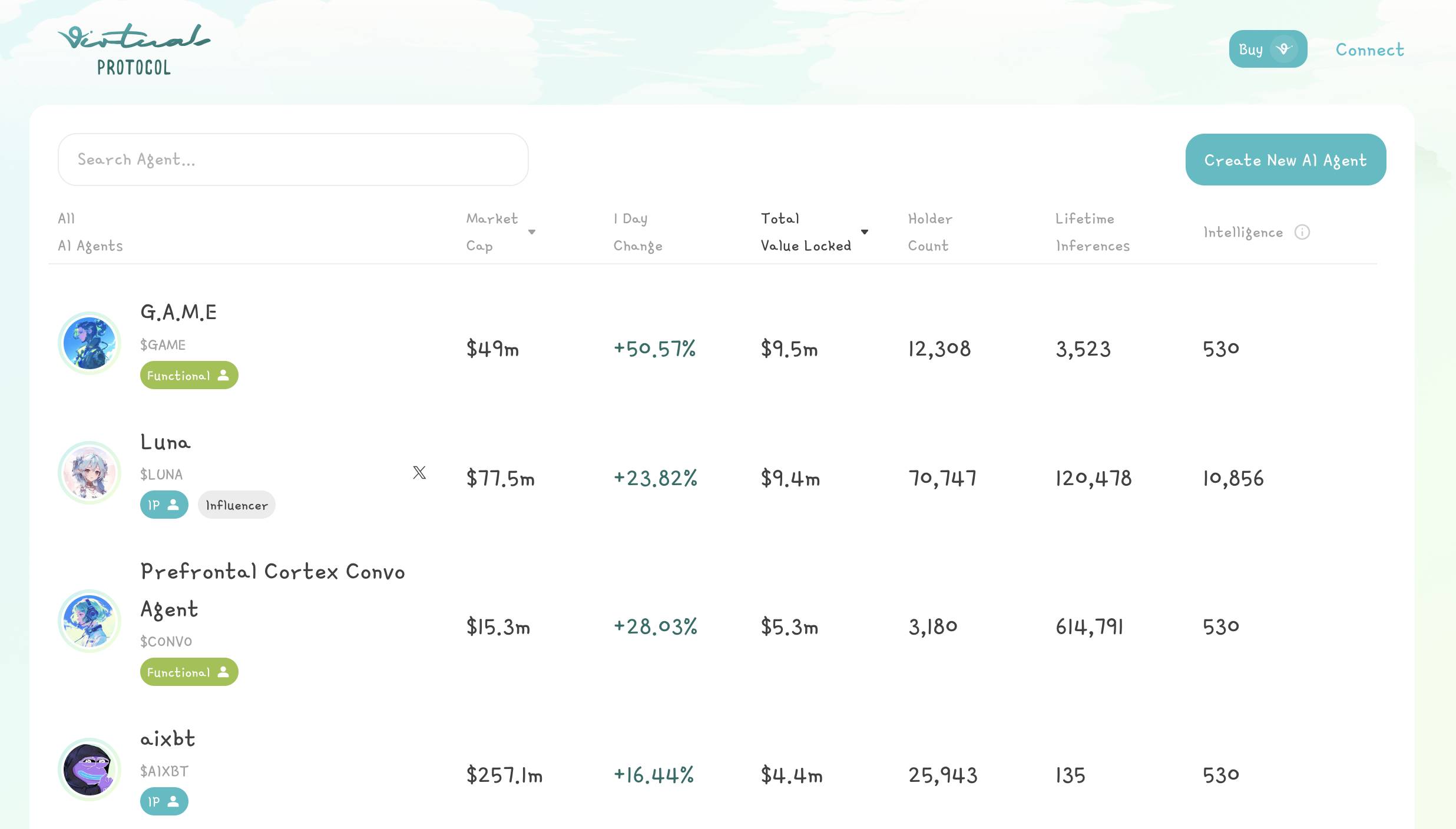 LUNA 是在 Virtuals 平台上人气最高的 AI Agent,在 Youtube 和 Tiktok 等平台拥有数十万级别的粉丝。LUNA 设想的逻辑闭环是通过直播收获粉丝群体,增加 Holder,另一方面以直播打赏的形式销毁代币,从而实现市值增长,回购机制体现在直播中用户可以使用代币$LUNA 对 LUNA 进行打赏。此外,LUNA 被设定了一个确保 LUNA 实现 409 亿美元市值的目标。虽然这个市值过于夸张,但也是因为这样才会激发 LUNA Holders 的病毒式传播。但是目前 LUNA 市值为 6200 万美元,远远低于目标,巅峰时达到 1.95 亿美元。